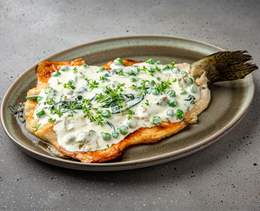 File de păstrăv la cuptor în sos cremos cu parmezan, spanac, capere și mazăre verde - 180/105