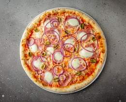 Pizza cu șuncă, măsline și ceapă roșie, sos de roșii - 590 g
