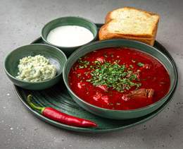 Borș clasic cu carne de vițel. Servit cu chifle cu usturoi, untură, smântână și ardei iute - 350/70/30 g