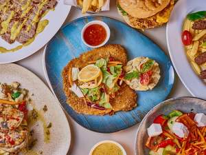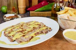 Veal kebabs, fried potatoes, tomatoes, grilled peppers, with barbecue sauce 400gr