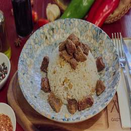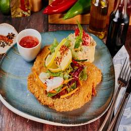Beef burger, caramelized onion, pickled cucumber seasoned with coriander, cabbage, fried potatoes 380gr