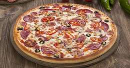 Ukusna kombinacija mozzarelle, sudžuka, salame, gljiva, maslina, kukuruza i zelene paprike na hrskavoj kori s umakom od rajčice