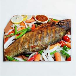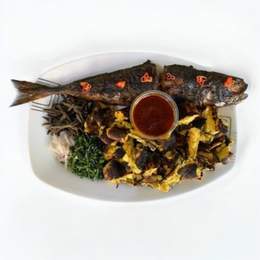 Contains one of each: plantain, yam, potato, full croaker fish, sauce and vegeta