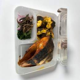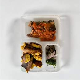 Contains one of each; plantain, yam, potato, cote fish portion, sauce and veget