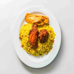 A pack of special fried rice and peppered chicken to go.