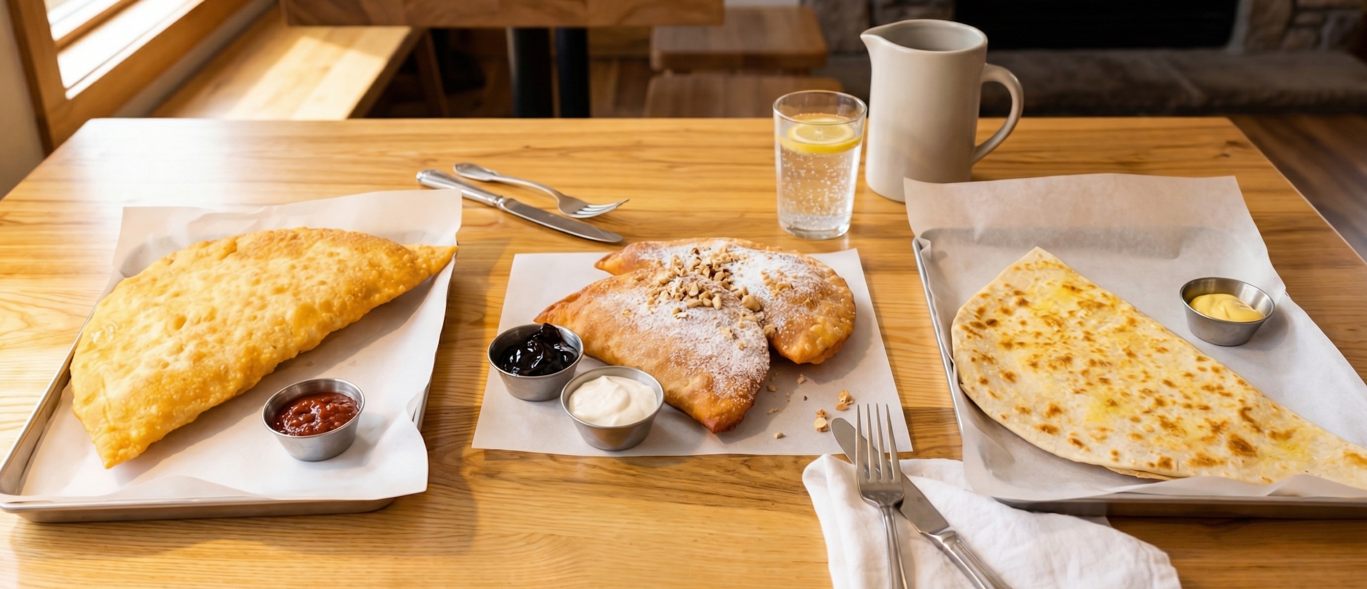 Сет з трьох чебуреків: з яловичиною; свининою, сиром та томатами; куркою та сиром чедер. Подаємо з аджикою та часниковим соусом на основі сметани.