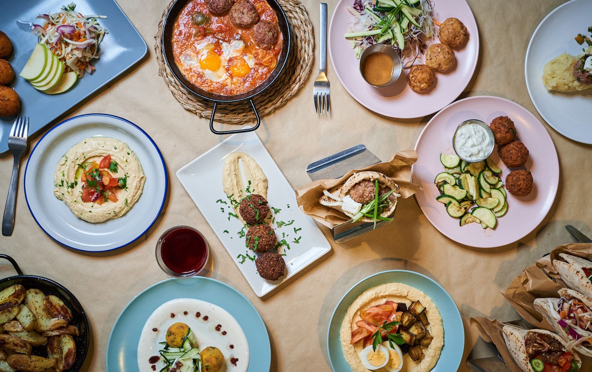 Nuestras míticas bolas de falafel servidas con hummus casero y ensalada de tomate