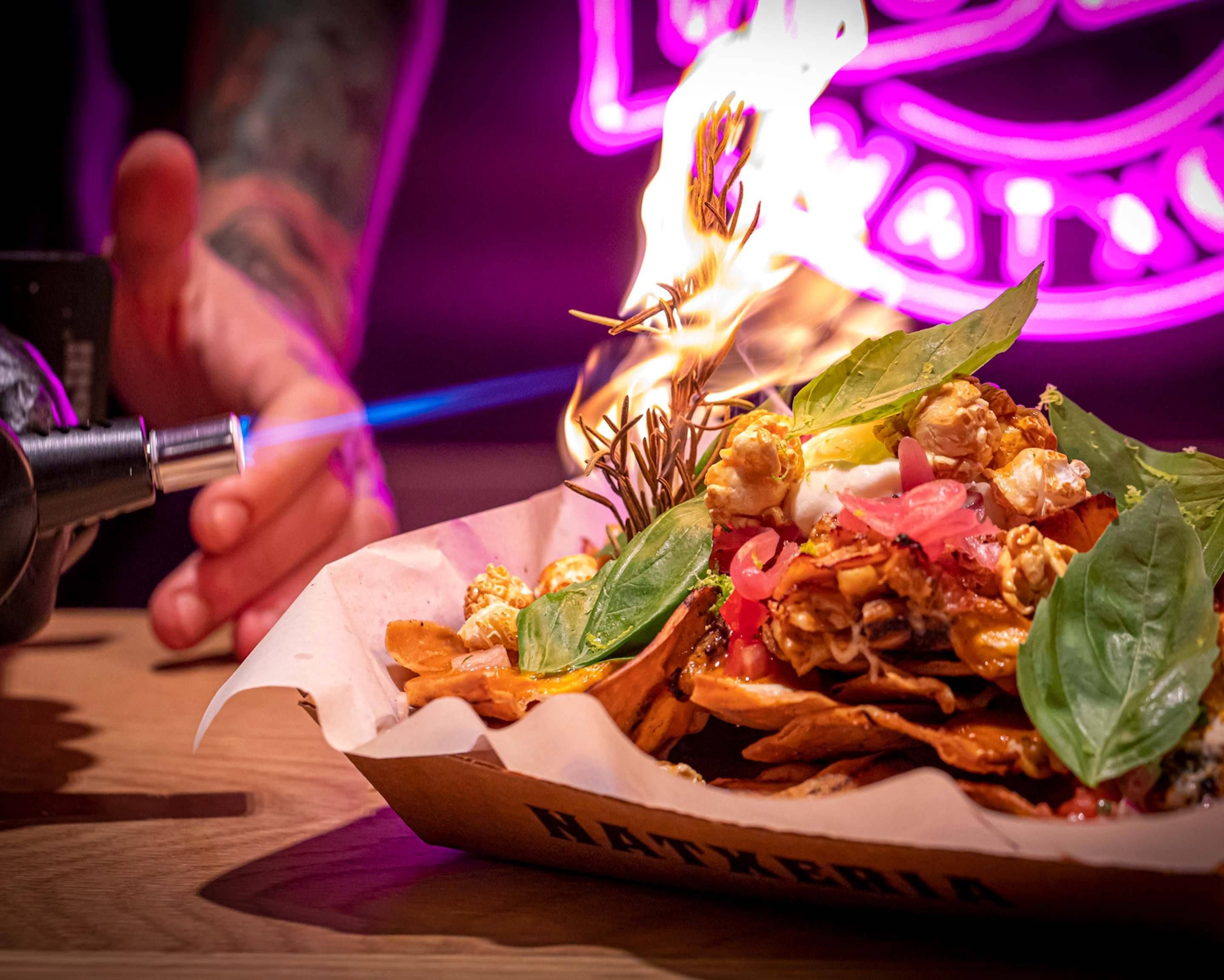 Estilo Michoacán. Mix de quesos, carnitas de cerdo confitadas, salsa verde mexicana, guacamole, cebolla y cilantro