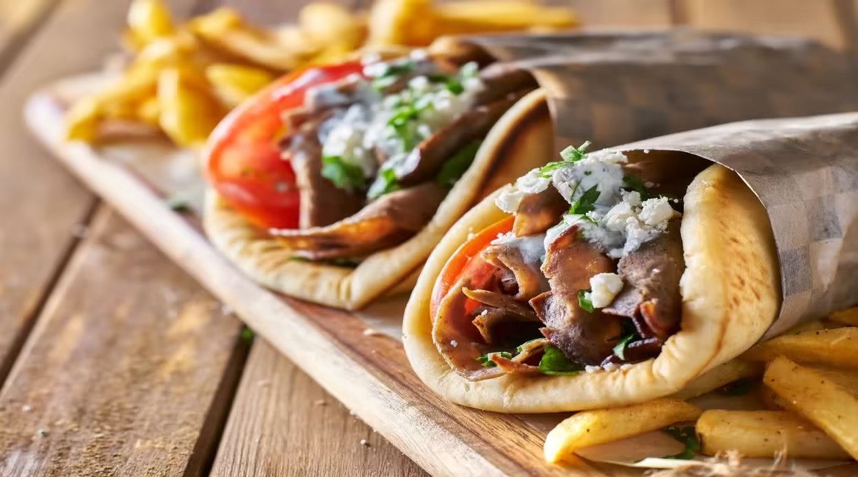 М’ясо баранини, капуста, картопля фрі, зелень, помідори, цибуля, часниковий соус