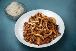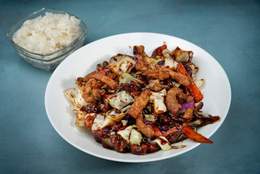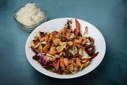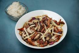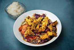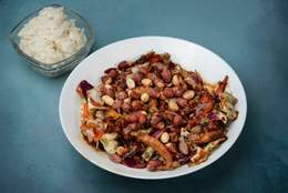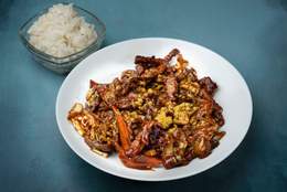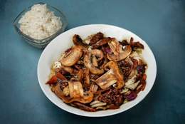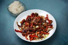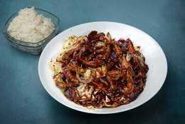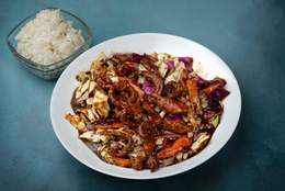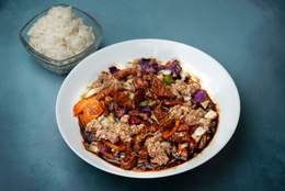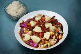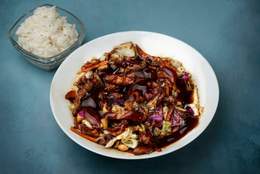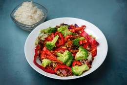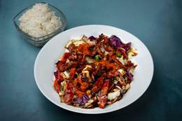 Meso sa povrćem (kupus zeleni, kupus crveni i sargarepa)u sosu, posluženo sa pirinčem na dnu ambalaže