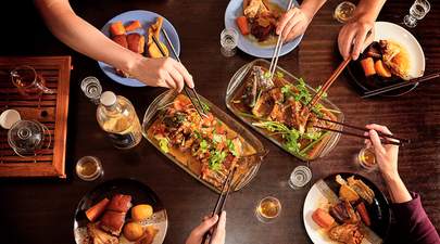 Meso sa povrćem u sosu, posluženo sa pirinčem na dnu ambalaže