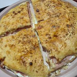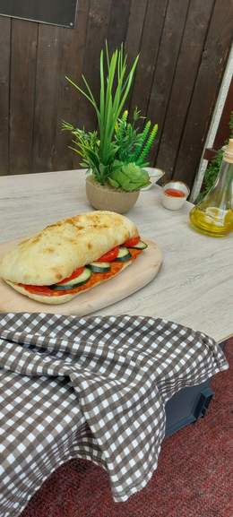 Porodični sendvič, pavlaka, šunka, pečenica, šampinjoni, kačkavalj. Prilog domaći kečap.