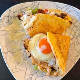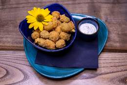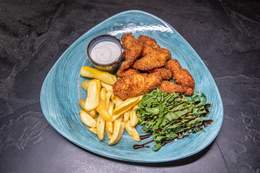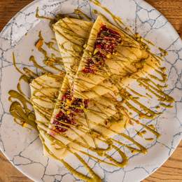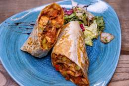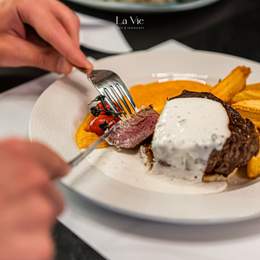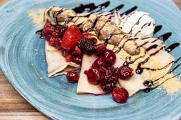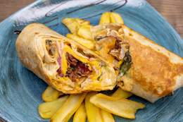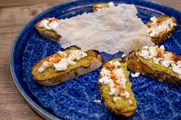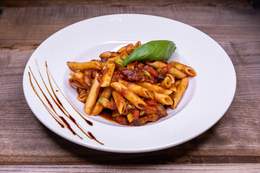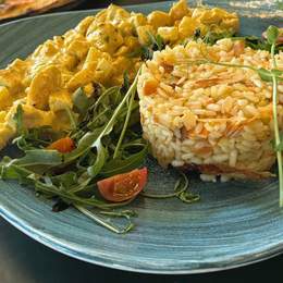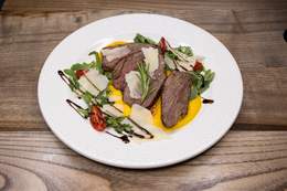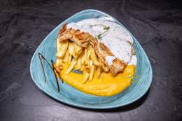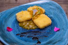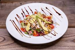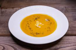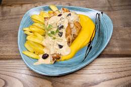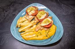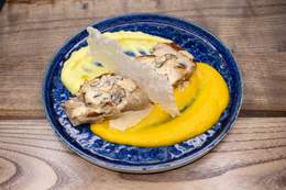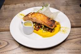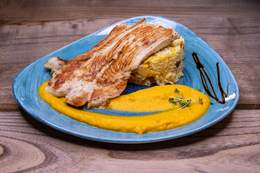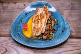 File lososa, tikvica, plavi paradajz, paprika, šampinjoni, pire od šargarepe, sos od zelenog bibera