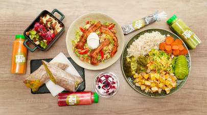 Mešavina zelenih salata, crveni pasulj, kukuruz šećerac, ljubičasti luk, masline, piletina, hrono hleb. Dresing maslinovo ulje, limunov sok, himalajska so, biber, bosiljak i čili