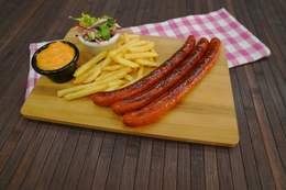 Najfinija kobasica od mesa, domaća dimljena ljuta 150g +pomfrit + salata +sos