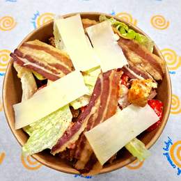 Cezar salata sa hrskavom slaninom, zelenom salatom i parmezanom.