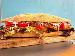 Baget od *tolokno brašna *brašno od pečene pa drobljene heljde ,humus sa bindevinim semnkama,hrskava tikvica u panko prezli,svež paradajz,feta sir ,salata