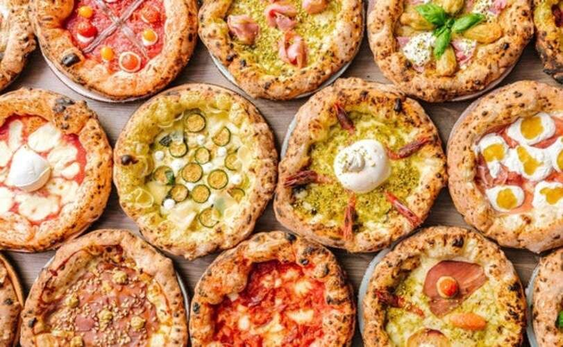 Mozzarella fiordilatte di Agerola, gorgonzola dolce, spianata calabra, cipolle, burrata, grana in scaglie e basilico