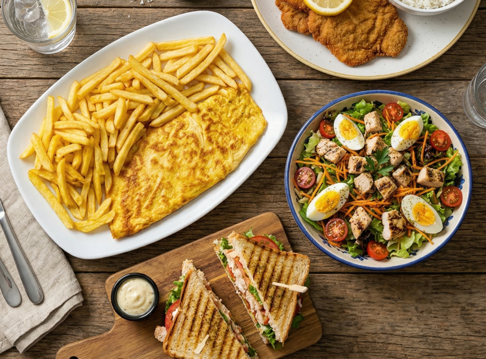 Omelete, queijo, fiambre, batatas fritas e salada. - (Imagem ilustrativa)