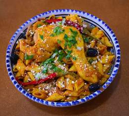 Pâtes penne, concentré de tomates, câpres, huile d'olive,
