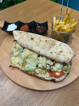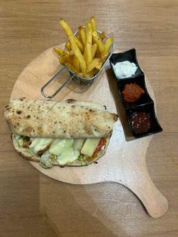 Escalope grillé, mozzarella ; harissa; salade mechouia ; sauce algérienne; sauce pesto ; légumes sautés ; laitue ; tomate ; onion et frittes