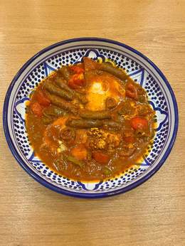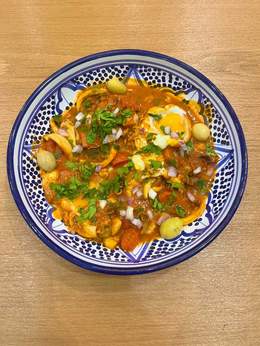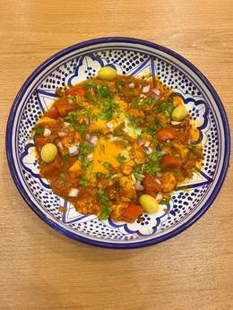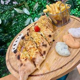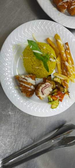 Escalope pané; mozzarella ; harissa; salade mechouia ; sauce algérienne; sauce pesto ; légumes sautés ; laitue ; tomate ; onion et frittes