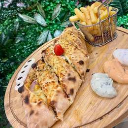 Avec mozzarella ; harissa; salade mechouia ; sauce algérienne; sauce pesto ; légumes sautés ; laitue ; tomate ; onion et frittes