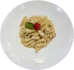 Sauce blanche, basilic, mozzarella, escalope, olives