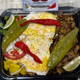 Omelette, Chawarma, fromage gruyère, mozzarella, frites