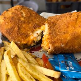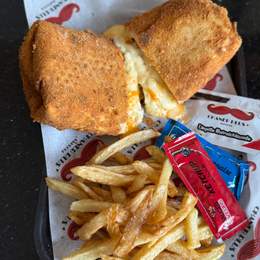 Sauce fromagére, mozzarella, gruyère, Escalope, frite