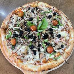 Un festival de légumes frais : sauce tomate, mozzarella fondante, champignons, aubergines, courgettes et olives. Une pizza colorée, saine et pleine de saveurs.