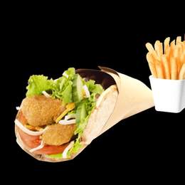 Un sandwich makloub généreusement garni d’une escalope de poulet panée, accompagnée de frites dorées et croustillantes. Le tout servi avec une boisson fraîche pour un repas complet, savoureux et pratique à emporter.