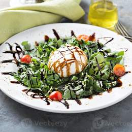 Burrata crémeuse posée sur un lit de roquette fraîche et de tomates juteuses, le tout délicatement arrosé d’une huile d’olive extra vierge pour sublimer chaque bouchée.