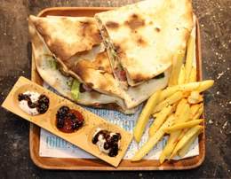 Harissa, mayonnaise, salade sautés, sauce fromagère, frite