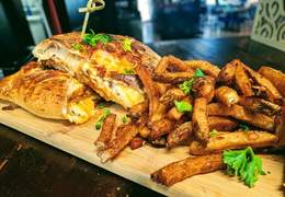 Double pâtes, double omelettes, cordon bleu, poulet grillé, bol de sauce fromage, frites, mozzarella