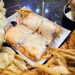 2 tortillas, 2 viandes, frites, sauce fromagère