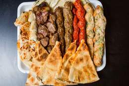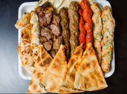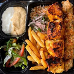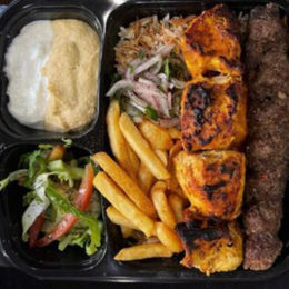 Kebab boeuf, Kebab poulet, Chich taouk. Servis avec du riz, patates, salade et pain