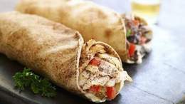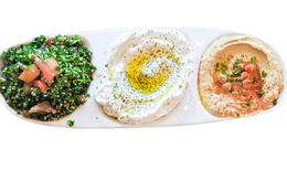 Hummus, kebab de poulet, tahini, citron, ail, huile d'olive