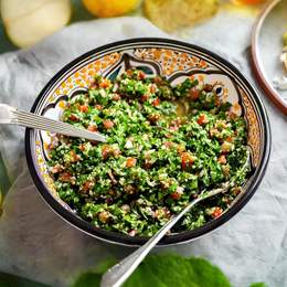 Boulgour fin, tomates, concombre, oignons, persil, menthe, citron, huile d'olive