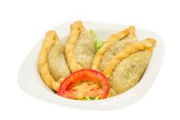 Pâte à sambousek, viande hachée, oignons, épices, pignons de pin, persil, sel, poivre.