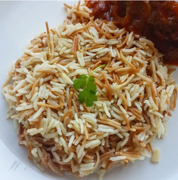 Bœuf haché, oignons, tomates, pois chiches, épices. Servi avec du riz, patates, salade et pain