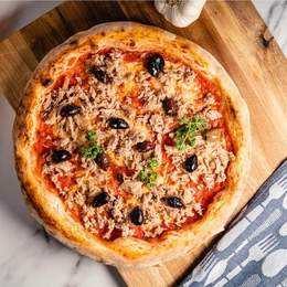Sauce tomate, thon, olives noires, câpres, fromage, escalope
