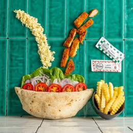 Poulet panée maison dans une pâte napolitaine cuite au feu de bois avec frites crinkles, garniture et suppléments au choix.