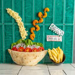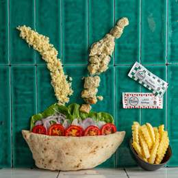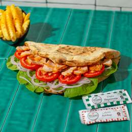 Crevettes moyennes panées dans un panuozzo cuit à la minute au feu de bois avec des frites crinkles , garniture et suppléments au choix.