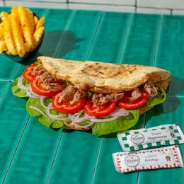 Thon en morceaux dans un panuozzo cuit à la minute au feu de bois avec des frites crinkles , garniture et suppléments au choix.