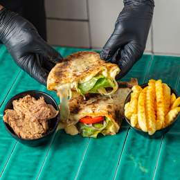 Jambon de dinde fumé dans un panuozzo cuit à la minute au feu de bois avec des frites crinkles, garniture et suppléments au choix.