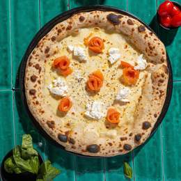 Une pate napolitaine au fromage mozzarella Filoni et du scamorza fumé, straciatella , granapadano, saumon frais , basilic frais , tomate cerise et huile d’olive.