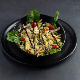 Blanc de poulet grillé, croûtons , gruyère, parmigiano, Laitue, roquette, tomate cerise,