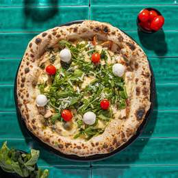 Une pate napolitaine au fromage mozzarella Filoni , du poulet fumé, sauce mushroom, straciatella, roquette, basilic frais , tomate cerise et huile d’olive.