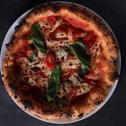 Sauce tomate italienne Mutti , burratina covelli, mozzarella covelli , grana padano, roquette, tomate cerise, basilic frais, huile d’olive